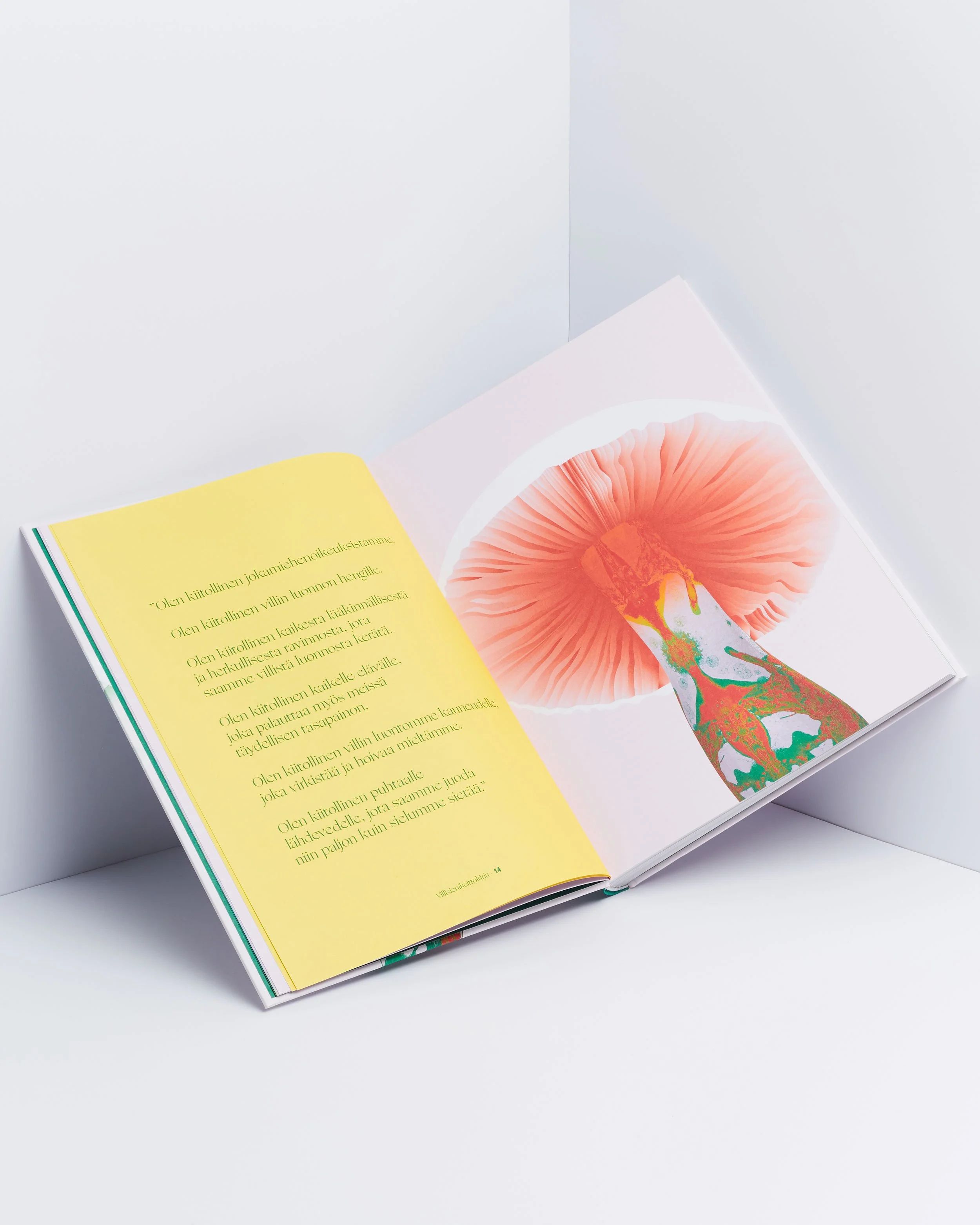 The brief called for a design that was “psychedelic, magical, and elegant”. The result is a bold and energetic book featuring vivid illustrations and a dynamic color scheme – a visual reflection of Tallberg’s vibrant personality. Each chapter has its own unique color combination, structuring the book while complementing the natural hues of the mushroom and recipe photography. Shades like pale pink and forest green were carefully chosen to enhance the appeal of the dishes while maintaining a visually rich and immersive experience.